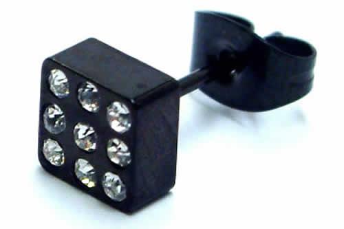 スクエア型のブラックの台座に9個のクリスタルジュエルがキラキラ輝くゴージャスなステンレスピアス。しっかりとした厚みのある台座と高級感のあるクリスタルのジルコニアが存在感を発揮してくれるピアス。綺麗な色味を引き出す大人のピアス。耳たぶだけでなく、軟骨(ヘリックス・トラガス)にも最適なピアスです。ボディーピアスの素材としてよく使われる低アレルギーのサージカルステンレスを通常のピアスサイズで製作したオススメのステンレスジュエリー。また素材がサージカルステンレスなのでファーストピアスにも利用できる。しかも、単品販売(片耳売り)なので、無駄なく、手頃な価格でゲットできるステンレスアクセサリー。