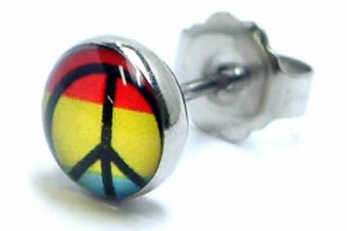 虹色の色鮮やかなキャンバスにピースマークをデザインしたポップなサージカルピアス。着けてるだけでラブ&ピースな気分にさせるオシャレなステンレスピアスです。耳たぶだけでなく、軟骨(ヘリックス・トラガス)にも最適なピアスです。ボディーピアスの素材としてよく使われる低アレルギーのサージカルステンレスを通常のピアスサイズで製作したオススメのステンレスジュエリー。また素材がサージカルステンレスなのでファーストピアスにも利用できる。しかも、単品販売(片耳売り)なので、無駄なく、手頃な価格でゲットできるステンレスアクセサリー。
