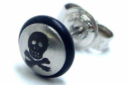 ステンレスピアスにスカルをデザインしたサージカルピアス。台座の周りに黒のゴムをセットすることで、装着するとまるでボディピアスのプラグ型のピアスを装着しているように見えるスタイリッシュでカジュアルなステンレスピアスです。耳たぶだけでなく、軟骨(ヘリックス・トラガス)にも最適なピアスです。ボディーピアスの素材としてよく使われる低アレルギーのサージカルステンレスを通常のピアスサイズで製作したオススメのステンレスジュエリー。また素材がサージカルステンレスなのでファーストピアスにも利用できる。しかも、単品販売(片耳売り)なので、無駄なく、手頃な価格でゲットできるステンレスアクセサリー。