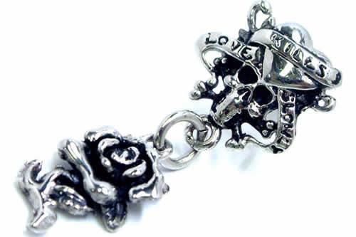 ハートのレリーフを掲げたスカルに一輪のバラの花をチャームにセットしたセクシーなステンレスピアスです。『生命』のハートと『死』をつかさどるドクロのコントラストがハードロックに決まるスカルピアスです。男女を問わないユニセックスなデザインがクール!ボディーピアスの素材としてよく使われる医療用のサージカルステンレスを通常のピアスサイズで製作した人気のステンレスジュエリー。また素材が比較的低アレルギーとされるサージカルステンレスなのでファーストピアスにも利用できるステンピアスは初心者から上級者まで愛用できる。しかも、単品販売(片耳売り)なので、無駄なく、手頃な価格でゲットできるステンレスアクセサリー。ステンレスは永遠に変わらない素材として、ペアアクセサリーにもよく使われます。もちろん、ボディピアスやシルバーアクセサリーとの相性もばっちり!