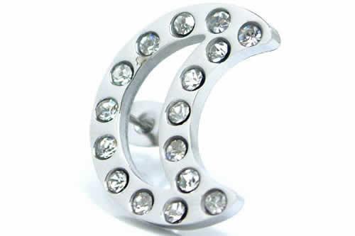 三日月型の大きなフォルムにクリスタルのジルコニアを散りばめた綺麗なシルエットのステンレスピアス。このピアスだけで十分にコーディネートの主役に使えるアイテムです。ボディーピアスの素材としてよく使われる医療用のサージカルステンレスを通常のピアスサイズで製作した人気のステンレスジュエリー。また素材が比較的低アレルギーとされる医療用サージカルステンレスなのでファーストピアスにも利用できるサージカルピアス。しかも、単品販売(片耳売 り)なので、無駄なく、手頃な価格でゲットできるステンレスアクセサリー。