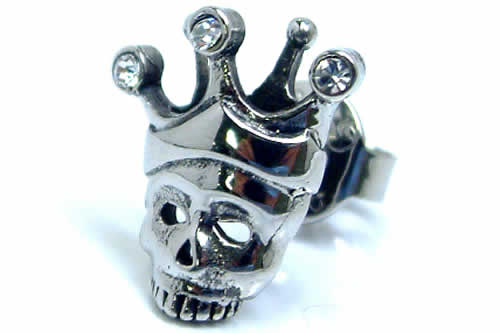 王冠をかぶったスカルをモチーフにした存在感のあるステンレスピアス。王冠部分にセットしたクリスタルのジルコニアが高級感を発揮!ボディーピアスの素材としてよく使われる医療用のサージカルステンレスを通常のピアスサイズで製作した人気のステンレスジュエリー。また素材が比較的低ア レルギーとされるサージカルステンレスなのでファーストピアスにも利用できるステンピアスは初心者から上級者まで愛用できる。しかも、単品販売(片耳売 り)なので、無駄なく、手頃な価格でゲットできるステンレスアクセサリー。ステンレスは永遠に変わらない素材として、ペアアクセサリーにもよく使われま す。もちろん、ボディピアスやシルバーアクセサリーとの相性もばっちり!デザインが豊富でプレゼントにも最高!