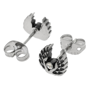 大きく広げた翼の真ん中にクリスタルのキュービックジルコニアが輝くステンレスピアス。セクシーなデザインワークが大人コーデをアシストしてくれる。ステンレスピアスはボディピアスの素材としてもよく使用されるとおり、比較的低アレルギー素材なので、ファーストピアスやセカンドピアスにも使える。また、1個から買えるので、無駄がなく価格も手ごろ。有名人も愛用者が多く、プレゼントにも最適のステンレスピアスです。耳たぶはもちろん、ヘリックスやトラガスなどの軟骨ピアスにも使えるのがステンレスピアスのいいところ。キャッチタイプなので、ピアス初心者でも簡単に着脱できる。デザインが豊富なのも嬉しい。