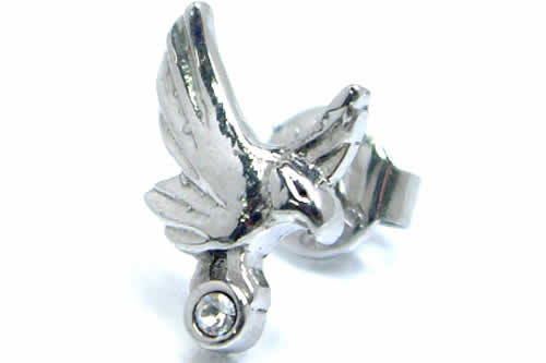 鷲をデザインしたアメリカンなステンレスピアス。小ぶりながらセットしたクリスタルのジルコニアが高級感をプラスしてくれるステンレスピアス。ステンレスピアスはボディピアスの素材としてもよく使用されるとおり、比較的低アレルギー素材なので、ファーストピアスやセカンドピアスにも使える。また、1個から買えるので、無駄がなく価格も手ごろ。有名人も愛用者が多く、プレゼントにも最適のステンレスピアスです。耳たぶはもちろん、ヘリックスやトラガスなどの軟骨ピアスにも使えるのがステンレスピアスのいいところ。キャッチタイプなので、ピアス初心者でも簡単に着脱できる。デザインが豊富なのも嬉しい。