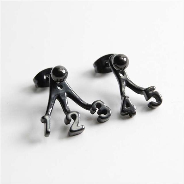 シンプルな4mmサイズの黒色のボールピアスに、1個は1と2と3、もう1個は4と5の数字をデザインしたバックキャッチをセットした面白いステンレスピアス。