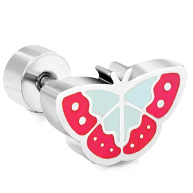 このチョウボディピアスは、ユニークで遊び心たっぷりのデザインが魅力です!シルバーカラーにピンクとブルーにエナメルコーティングした蝶々がカワイイステンレスピアス。キャッチもポストもデザインも全てステンレス素材で作られており、耐久性もバッチリ。ネジタイプのストッパーキャッチで、しっかりと固定できるので安心です。20ゲージのサイズは、ファッションピアスと同じサイズなので、気軽に楽しめ、耳たぶだけでなく、耳の軟骨やヘリックス、トラガスにぴったり。デートでのアクセントとしてもおすすめです。チョウチョウは男女を問わず人気なので、ペアルックやプレゼントにも最適ですよ!メンズ・レディース問わず楽しめるアイテムです。