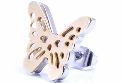 ステンレスカラーとゴールドカラーのバタフライを重ねた立体感のあるチョウのピアス。程よい大きさでどんなスタイルにもマッチしてくれるスタッフもお奨めのピアス。ボディーピアスの素材としてよく使われる医療用のサージカルステンレスを通常のピアスサイズで製作した 人気のステンレスジュエリー。また素材が比較的低ア レルギーとされるサージカルステンレスなのでファーストピアスにも利用できるステンピアスは初心者から上級者まで愛用できる。しかも、単品販売(片耳売り)なので、無駄なく、手頃な価格でゲットできるステンレスアクセサリー。ステンレスは永遠に変わらない素材として、ペアアクセサリーにもよく使われま す。もちろん、ボディピアスやシルバーアクセサリーとの相性もばっちり!デザインが豊富でプレゼントにも最高!