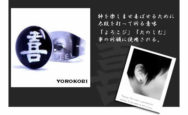 喜をデザインした和テイスト満点の漢字ピアス。個性的なコーデに!大きさも程よく、耳たぶだけでなくヘリックスピアスにもオススメのピアス。ボディーピアスの素材としてよく使われる医療用のサージカルステンレスを通常のピアスサイズで製作した人気のステンレスジュエリー。また素材が比較的低アレルギーとされる医療用サージカルステンレスなのでファーストピアスにも利用できるサージカルピアス。また、ステンレスは丈夫で軽量なので、毎日使いにもオススメのキャッチピアスです。ステンピアスは初心者から上級者まで愛用できる。しかも、単品販売(片耳売り)なので、無駄なく、手頃な価格でゲットできるステンレスアクセサリー。もちろん、ボディピアスやシルバーアクセサリーとの相性もばっちり!デザインが豊富でプレゼントにも最高!