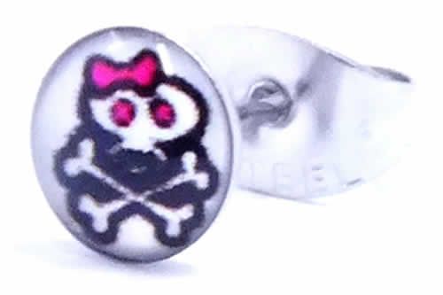 リボンをつけたとスカルが可愛いステンレスピアス。女の子にお奨めのスカルピアス!大きさも程よく、耳たぶだけでなくヘリックスピアスにもオススメのピアス。ボディーピアスの素材としてよく使われる医療用のサージカルステンレスを通常のピアスサイズで製作した人気のステンレスジュエリー。また素材が比較的低アレルギーとされる医療用サージカルステンレスなのでファーストピアスにも利用できるサージカルピアス。また、ステンレスは丈夫で軽量なので、毎日使いにもオススメのキャッチピアスです。ステンピアスは初心者から上級者まで愛用できる。しかも、単品販売(片耳売り)なので、無駄なく、手頃な価格でゲットできるステンレスアクセサリー。もちろん、ボディピアスやシルバーアクセサリーとの相性もばっちり!デザインが豊富でプレゼントにも最高!