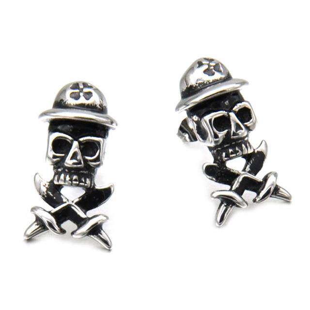 麦わら帽子なのかヘルメットなのか、ユニークなスカルが帽子を被った海賊旗をモチーフにしたユニークなピアス。サーベルでクロスしたドクロの顔が不気味にほほ笑むステンピアス。立体感のある大きなデザインが存在感をアピールできるメンズピアス。女性も男性も使えるステンレスピアス。ペアルックやプレゼントにも!