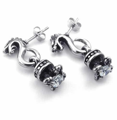竜のピアスに王冠をモチーフにしたチャームが揺れるスタイリッシュなステンレスピアス。ポストだけでなく台座の部分もステンレスなので安心。高級感もありプレゼントにもおすすめです。メンズの存在感あるピアスをお探しの方におススメ!彼氏へのプレゼントにも。