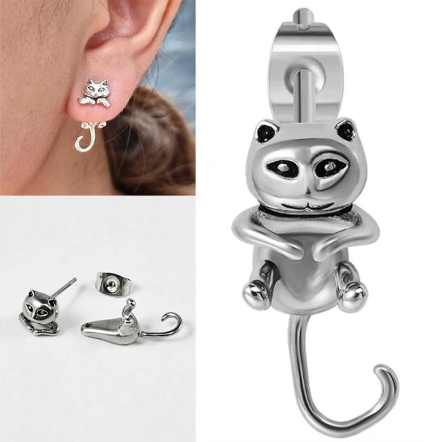猫の頭のピアスに猫の胴体のチャームを通した立体的でユニークなバックキャッチタイプのステンレスピアス。