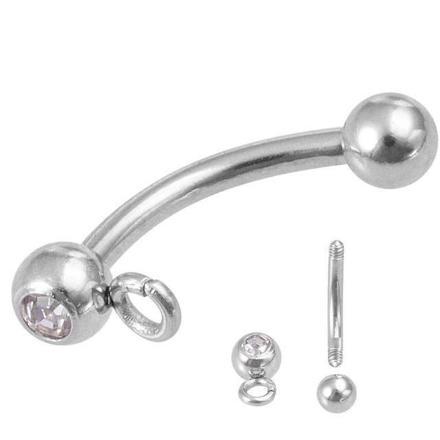ステンレス製の16ゲージのカーブバーベルにチャームがぶら下げれるマルカン付きクリスタルのジルコニアをセットしたボールをセットしたDIY用ボディピアス。