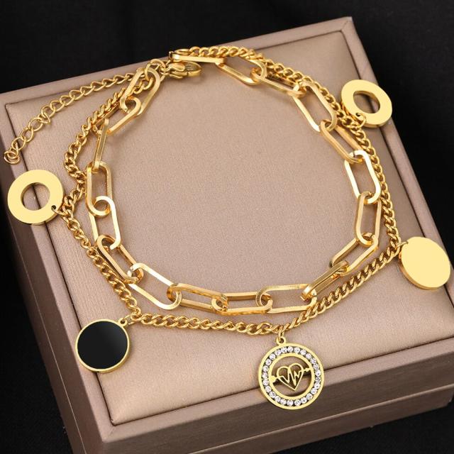 楕円形のオーバル型のチェーンと細めの喜平チェーンの2連アンクレットに、クリスタルのキュービックジルコニアのキラキラのフレームにハートに弓矢が刺さったデザインとエナメルコーティングした黒色ブラックの丸型のチャームとシンプルなリング型のチャームが揺れるステンレス製のアンクレット。