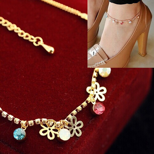 春らしいカラフルなビジューとお花のチャームが揺れるゴールドアンクレット。