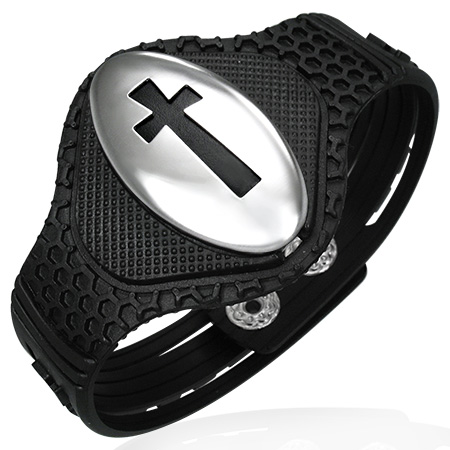 ラバー素材のブレスレットにステンレスパーツで十字架をデザインしたブレスレット。
