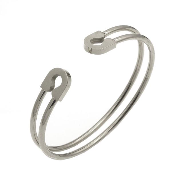 安全ピンをモチーフにしたサージカルステンレス316L製の面白いステンレスバングル。シンプル綺麗なフォルムは、カジュアルなスタイルでもフォーマルなスタイルにも似合うバングルです。他のブレスレットとの重ね付けにも。素材がステンレスなので、毎日使っても丈夫で安心。サイズが合えばアームレットにも使えるステンレスバングルです。プレゼントにもおすすめ。