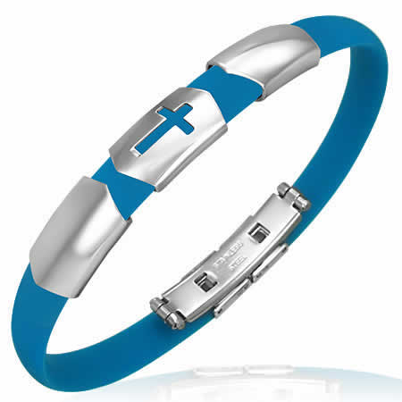 ステンレスプレートに十字架の盾をモチーフにしたデザインを描いたブルーラバーラバーブレスレット。