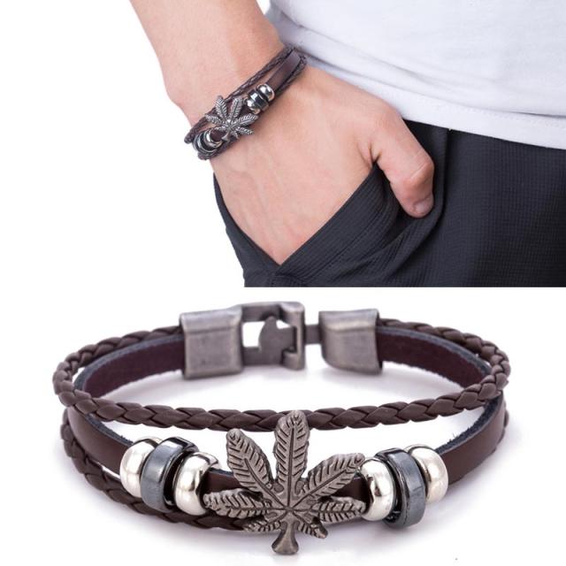 茶色いレザーを編み込んだブレスレットとマリファナをデザインしたパーツをセットしたブレスレットの3連タイプのおしゃれなブレス。重ね付けしているような茶色の革のラップブレスレットは男性からの支持率も高いアクセサリー。メンズでもレディースでも使えるので、ペアルックやプレゼントにも最適。高級感もありフォーマルなスタイルにも似合う。