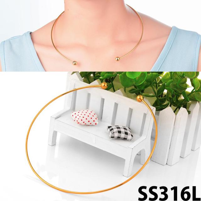 ボディーピアスのサーキュラーバーベル型の金メッキされたシンプルな細身のバングルタイプのステンレスネックレスです。細身で個性を発揮できるおしゃれな金のネックレス。ネックレスチェーン等とは違って、固定タイプのチョーカーは、上品なスタイルをアシストしてくれる。ドレッシーなスタイルと高級感のあるステンレスの素材感が大人の女性を演出してくれる。ペンダントトップを通してつかったり、シンプルなネックレスチェーンとの重ね付けしたり、使い方は自由自在のオススメのジュエリー。シンプルですが個性的なチョーカーが存在感を発揮してくれます。プレゼントとしても◎カジュアルなスタイルだけでなくスーツなどのフォーマルなスタイルにもバッチリきまるネックレスです。