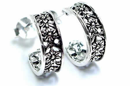 厚みの半円型のプレートに、お花を透かし彫りにした女性に人気のハーフリングピアス。花びら一つ一つにいたるまで細やかにデザインされた美細工なお花のピアスは高級感たっぷり。透かされたお花が立体感を演出。女性人気のモチーフのお花をココまで綺麗に仕上げたピアスは見事。程よい厚みが存在感を発揮してくれる。ハーフリングタイプはリングピアスが苦手な人でも、キャッチタイプなので簡単に装着でき、装着すればリングピアスのように見える。