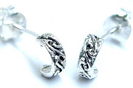 小振りな半円型のプレートにデザインされた壁画のようなハーフフープピアス。小振りながら存在感を発揮できるデザインがいい。小さなフープピアスの装着が苦手な人でもこのハーフタイプなら、キャッチ式なので装着も簡単。男女を問わないユニセックスなピアスなのでペアで愛用するのもオススメです。プレゼントにも最適!