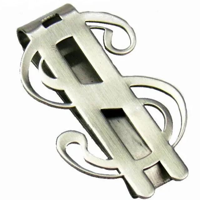 銀色シルバーカラーのドルマークをモチーフにしたステンレス製のマネークリップ。