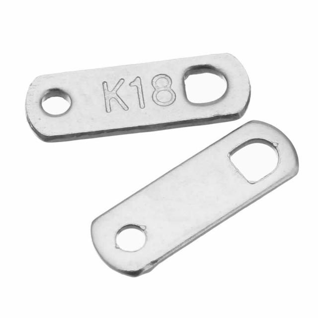 ステンレス製のプレートにK18(18金の意)の刻印を打ち込んだステンレスパーツ。ステンレス素材のステンレスパーツに18金の刻印をデザインした珍しいパーツ。ピアスやネックレスのチャームパーツや、ブレスレットやアンクレットのパーツなど、アクセサリーのデコレーションやDIY、修理などに使える。しかも安心で丈夫なステンレス素材なので、高級感もあって低アレルギー、丈夫で長持ちしてくれるのもうれしい。自分でアクセサリーを作る人には最適のアイテムです!