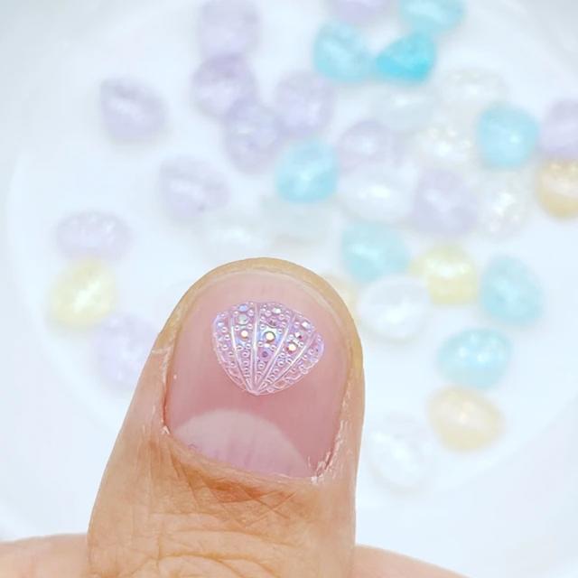 レッド、イエロー、ブラック、ブルー、ホワイト、グリーン、パープル、ピンクなどカラフルな貝殻をデザインしたネイルやデコレーションパーツに使えるDIY用アクリルパーツ。