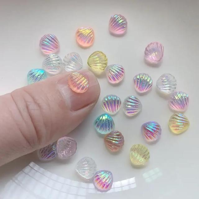 レッド、イエロー、ブラック、ブルー、ホワイト、グリーン、パープル、ピンクなどカラフルな貝殻をデザインしたネイルやデコレーションパーツに使えるDIY用アクリルパーツ。