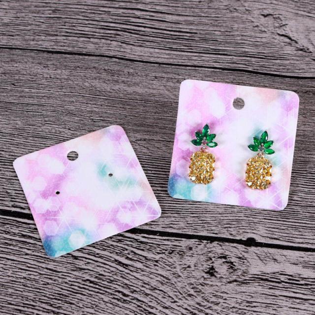壁掛け用にセンターの上に穴の開いた5cmx5xmの四角形の台紙に2個の穴をあけたピアス用台紙。スタッドピアス、キャッチピアス、フックピアス、チェーンピアスなどをディスプレイするのに適した紙でできたペーパータグ。可愛いデザインも多数取り揃えました。大きさも小振りでピアスのデザインを邪魔しないシンプルさが業者さんにも人気。手作りのピアスを作ってプレゼントするときや、フリマで販売するときやお店のディスプレイやスタンドなど使い道は色々。DIYしたピアスをインスタでアップするときでも、台紙があるだけで映える。5枚セットのばら売りで少ない数で購入できるのもうれしい。