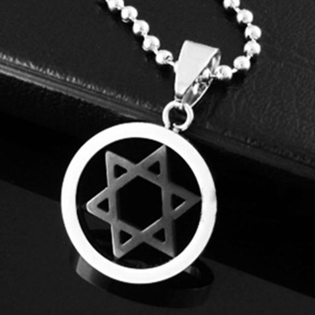大きめの丸型のフレームに黒色の六芒星ダビデスターをデザインしたサージカルステンレス316L製のトップにサージカルステンレス316L製のシンプルなボールステンレスチェーンに通したステンレスネックレス。