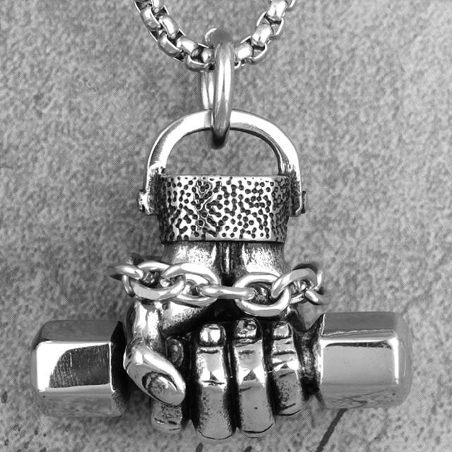 鉄アレイを握った拳をモチーフにしたステンレスペンダントトップを3mmの甲丸リングチェーンに通したネックレス。
