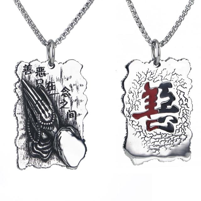大きなドッグタグ型に片面には漢字で善と悪を合わせた文字を、もう片面には不気味な手で拝みながら念仏をデザインしたステンレスペンダントを3mmのステンレスチェーンに通したネックレス。これだけで着けてもいいし、革製のネックレスと重ね付けしてもおしゃれ。
