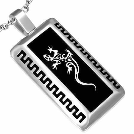 ブラックとトカゲ型にカットアウトしたシルバーカラーの2枚のドッグタグがクールなイメージを醸し出すステンレストップです。