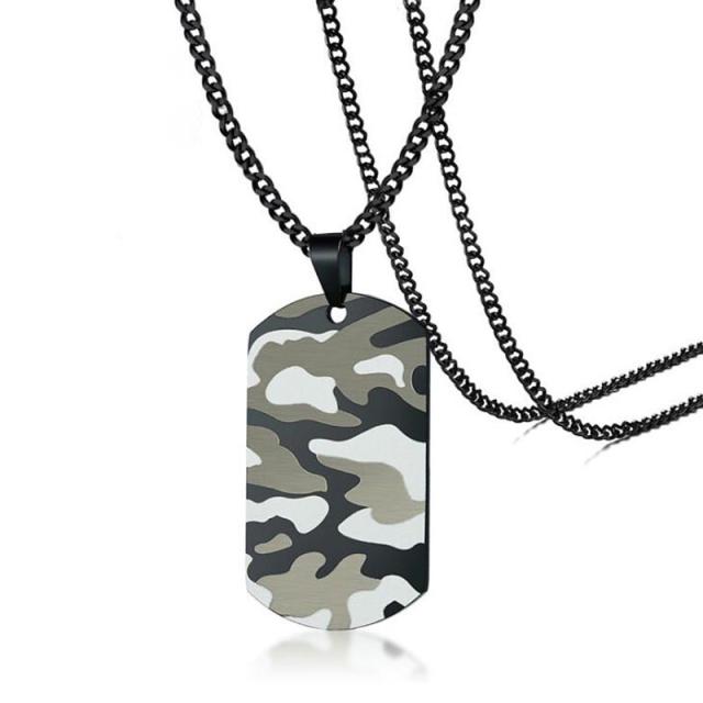 迷彩柄のドッグタグ型ペンダントトップに黒色のシンプルなステンレスチェーンに通したネックレス。これだけで着けてもいいし、革製のネックレスと重ね付けしてもおしゃれ。