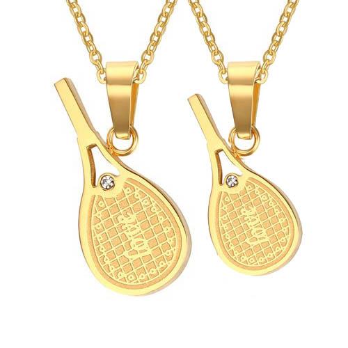 テニスラケットをモチーフにしたデザインにLOVEとアルファベットをデザインしクリスタルのジルコニアをセットしたゴールドカラーのメンズ用レディース用を2個1セットにしたペアルック用ネックレス。