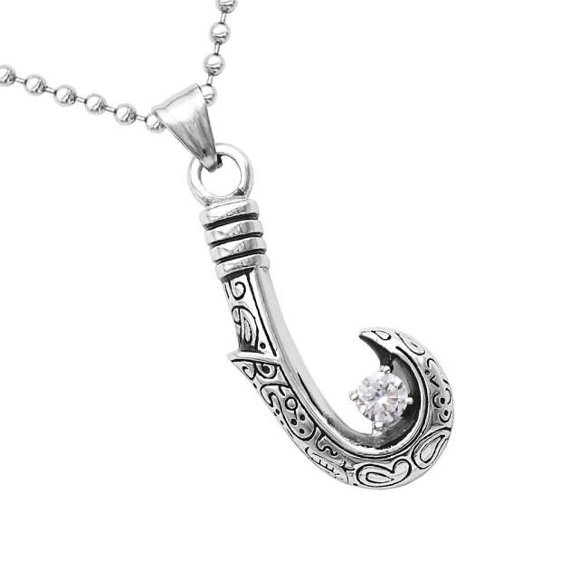 クリスタルジュエルトライバルフックステンレスネックレス(50cmのステンレスチェーン付き) ボールチェーン ネックレスチェーンつき ペンダントトップ サージカルステンレス316L メンズ レディース チョーカー 首飾り 3D 釣針 フィッシュフック 釣り針 ジルコニア クリア