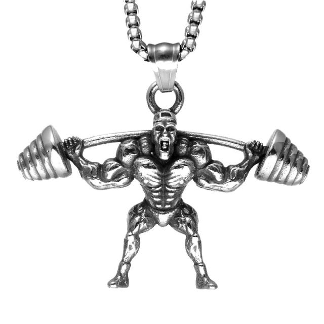 重量挙げステンレスネックレス(60cmのステンレスチェーン付き) ネックレスチェーンつき ペンダントトップ サージカルステンレス316L メンズ レディース チョーカー 首飾り 3D 立体 おもしろ 面白い マッスル 筋肉 ボディビル マッチョ 筋トレ 人間 人型 ダンベル バーベル
