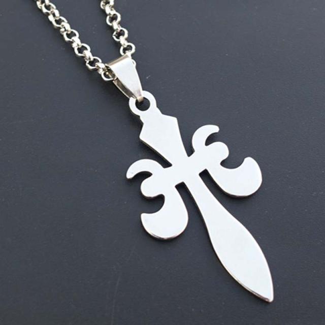ステンレス製の百合の紋章のステンレスペンダントトップを3mmのリングチェーンに通したネックレス。ユリの紋章を完全にカットアウトしているので、立体感を感じさせるペンダントトップです。これだけで着けてもいいし、革製のネックレスと重ね付けしてもおしゃれ。