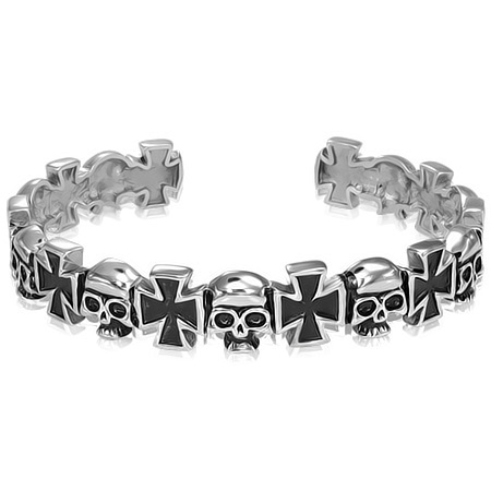 スカルとアイロンクロスをいくつもデザインしたスタイリッシュなステンレスバングル。