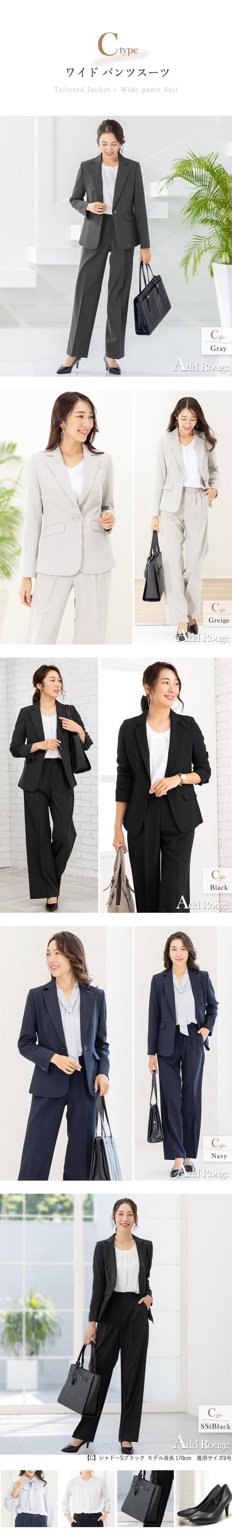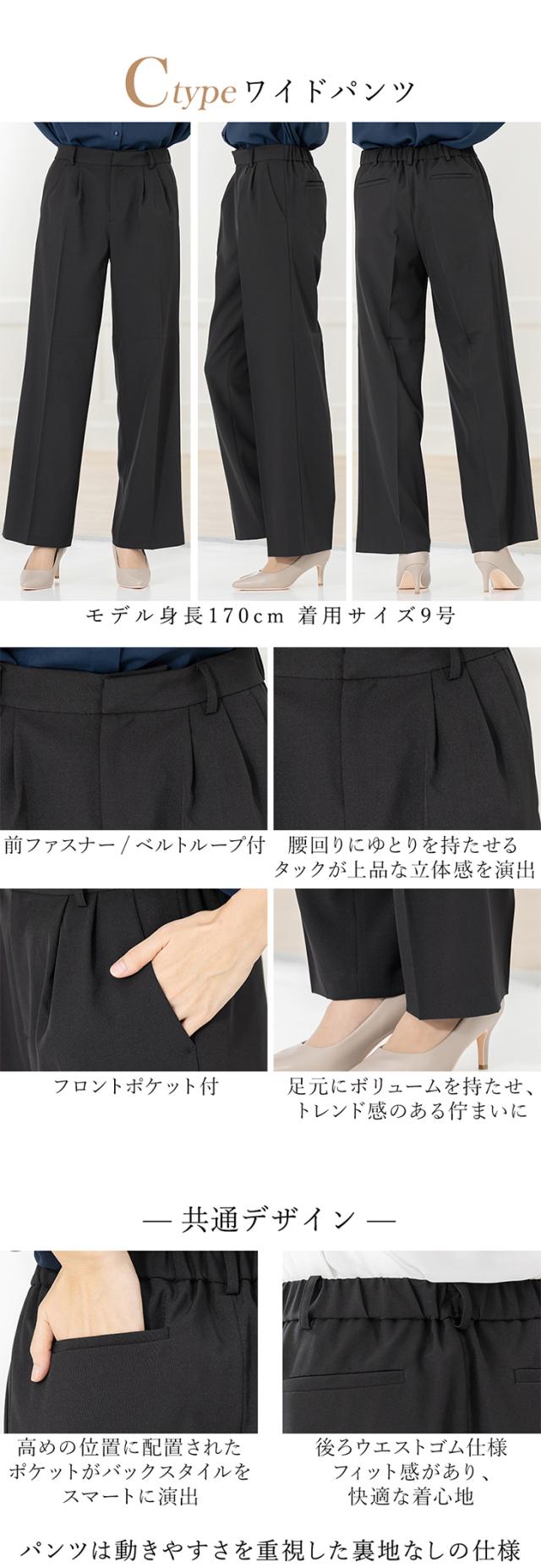 パンツは選べる3デザイン。ヒップ回りがゆったり&裾が引き締まったシルエットで美脚が叶うテーパードパンツ、大人カッコいいスマートなストレートパンツ、エレガントで体型カバーもできるワイドパンツをご用意しました。
