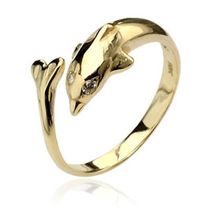 10金のトゥリング全体でいるかをデザインしたポップでゴージャスなゴールドリング。