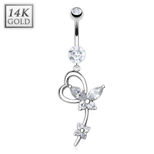 14金ラブバタフライへそピアス(ホワイトゴールド) 14G 14ゲージ 蝶 チョウチョウ 臍ピアス ヘソピアス ボディピアス 大人 本物の金 安心素材 K14W 白金 高級 プレゼント ギフト メンズ レディース ボディーピアス バナナバーベル クリスタル ジルコニア カーブバーベル