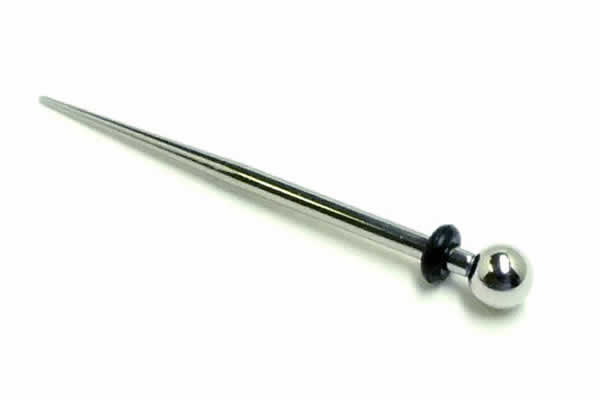 拡張器のインサーションピンとバーベルを融合させたユニークなボディピアス。拡張器としても使えるし、装着するとバーベルに見える。ネジはボールにねじ山のある安心のインターナル。素材も安心のサージカルステンレス。1個で2役の便利で個性的なボディピアス。まるで丸ピンや画鋲のように見える。私には魔法使いの杖に見えます。