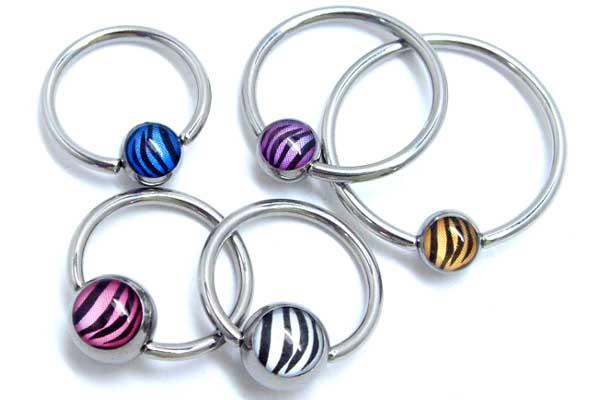 ボディーピアスの定番キャプティブビーズリングにシマウマ模様のゼブラパターンのボールをセットしたボールクロッシャーリング。コントラストのきいたカラーリングが一際眼を引くボディアクセサリー。シックなコーディネートや可愛いコーディネイトとどちらにもも似合うデザインのアクセサリーです。