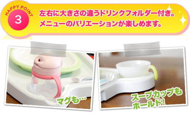 トレイの左右には大きさの違うドリンクホルダーが付いているので、マグもスープカップもらくらくホールド♪