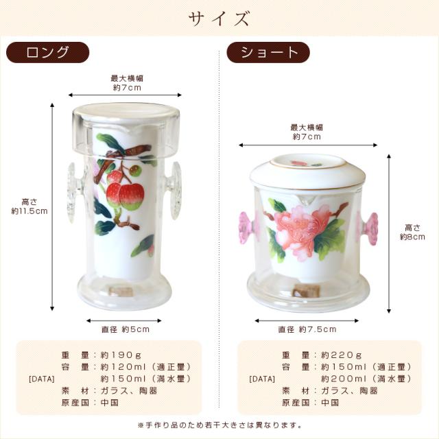 | サ イ ズ | 【ロング】 高さ 約11.5cm×直径 約5cm×最大横幅 約7cm 重量 約190g 容量 約120cc(適正量) 約150cc(満水量) 【ショート】 高さ 約8cm×直径 約7.5cm×最大横幅 約7cm 重量 約220g 容量 約150cc(適正量) 約200cc(満水量) |
