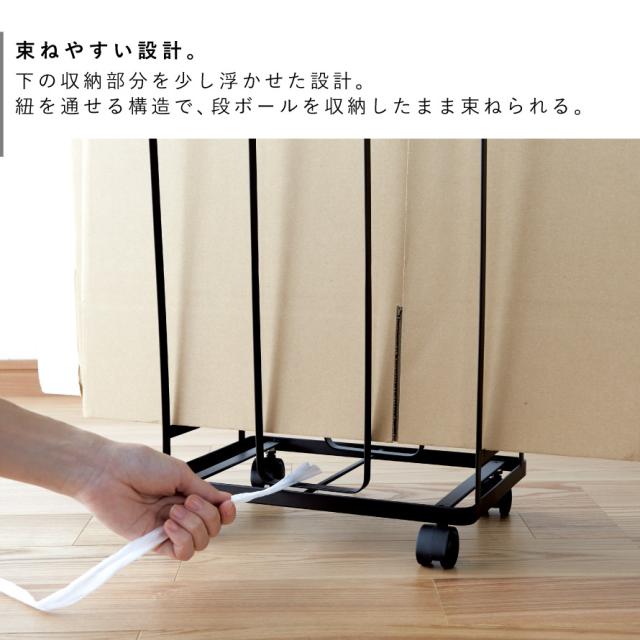 下の収納部分が少し浮かせて設計してあり、紐を通せる構造になっています。段ボールを収納したまま束ねることができ、ゴミ出しもスムーズ。