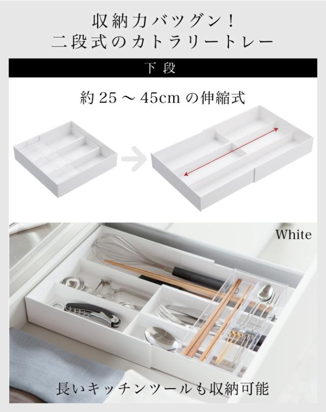 上段のスライド式トレーには箸や箸置き、ティースプーンなどの小物を分けて収納。下段の伸縮式トレーにはフォークやナイフだけでなく、菜箸やフライ返しといった長いキッチンツールも収納できます。